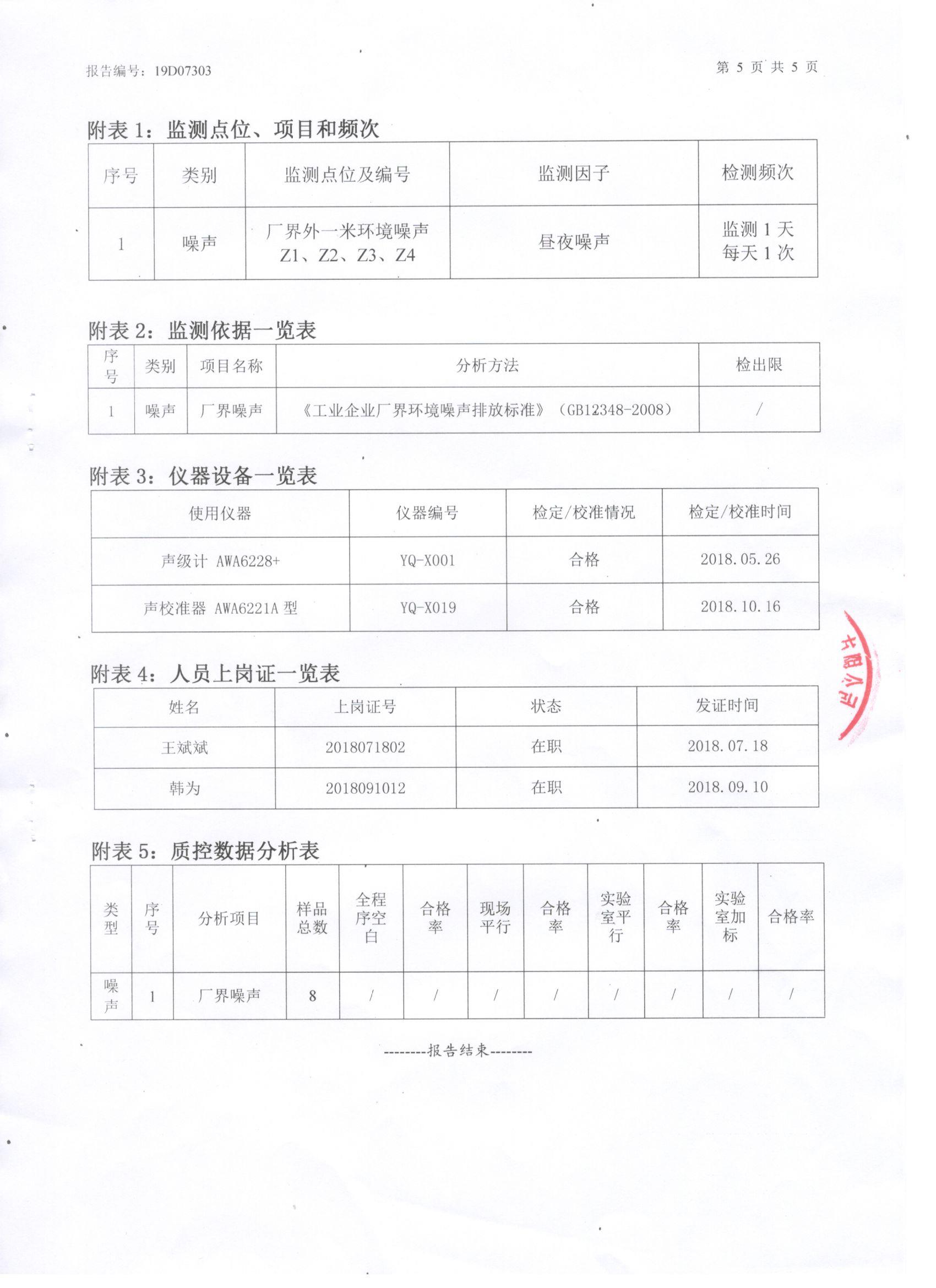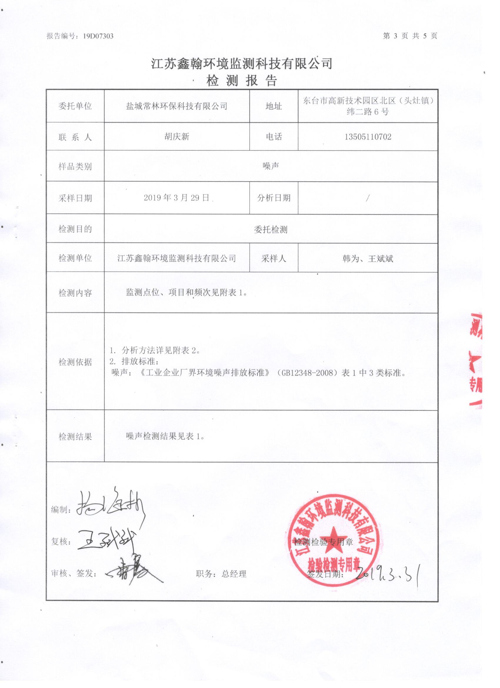 公司2019年第一季度厂界噪声检测报告公示 您现在的位置:盐城常林环保科技有限公司 >> 信息发布 >> 正文内容   2019年05月16日 点击: 次 盐城常林环保科技有限公司2019年第一季度厂界噪声检测报告公示如下: [ 字体:小 大 ] [ 收藏 ] [ 打印文章 ] 相关文章 没有相关内容