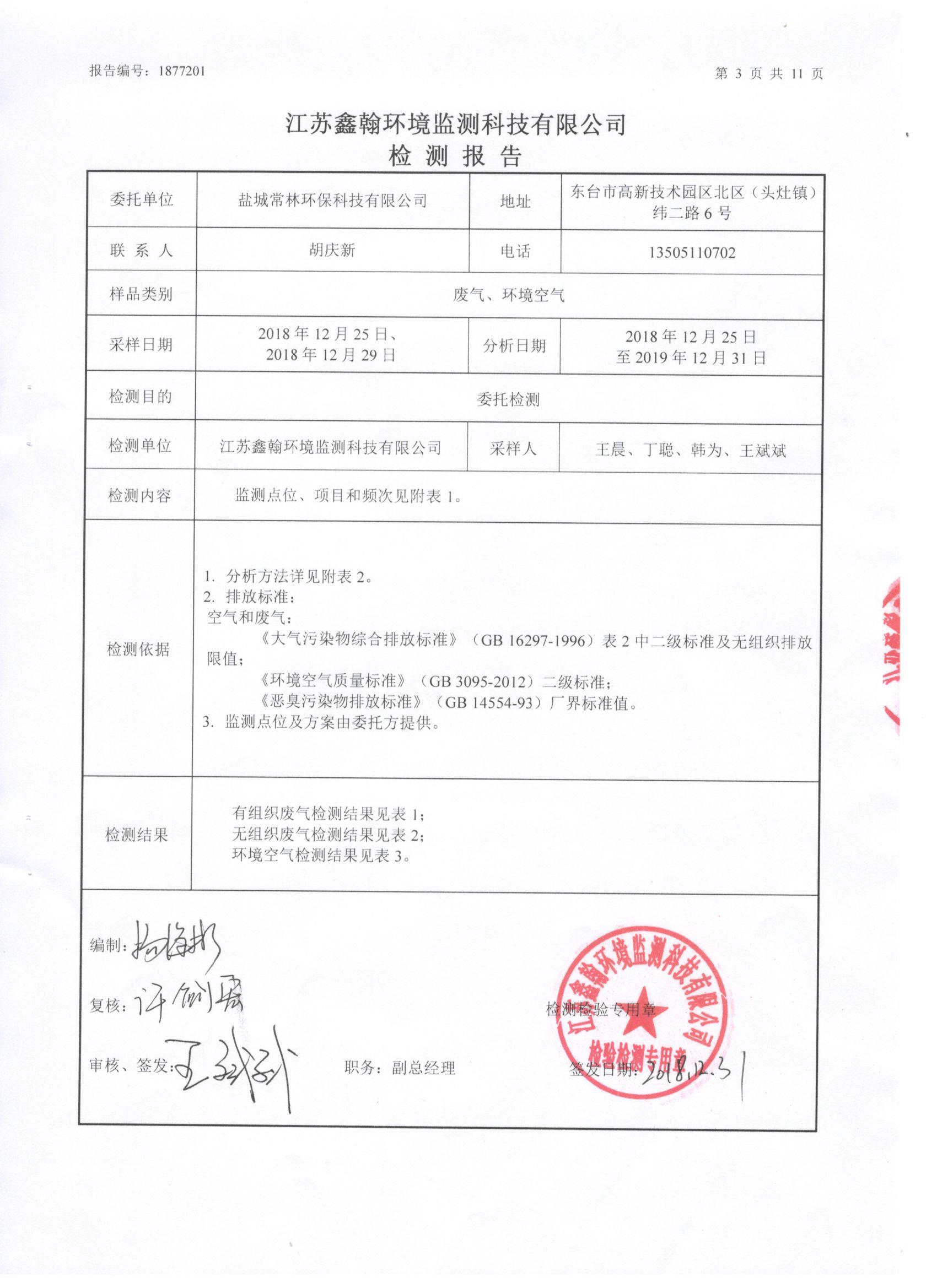 公司废气及环境空气检测报告 您现在的位置:盐城常林环保科技有限公司 >> 信息发布 >> 正文内容   2019年05月14日 点击: 次 盐城常林环保科技有限公司2018年第4季度有组织废气、无组织废气及环境空气检测报告公示如下: [ 字体:小 大 ] [ 收藏 ] [ 打印文章 ] 相关文章 没有相关内容