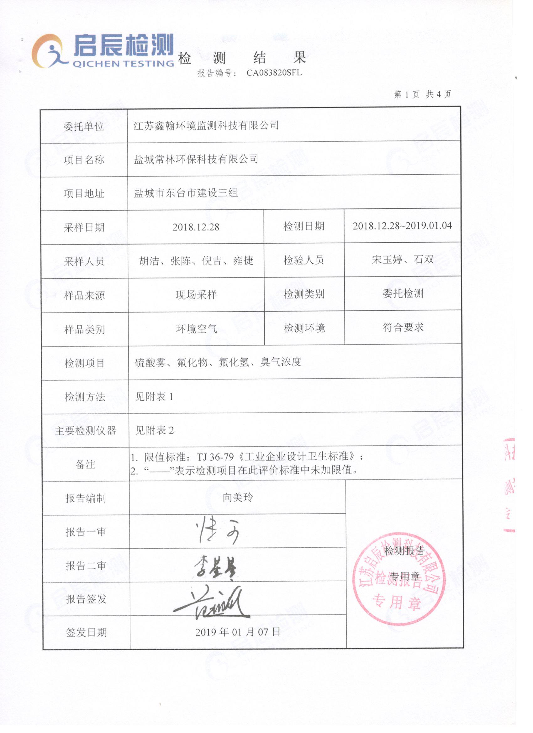 公司2018年第4季环境空气检测报告 您现在的位置:盐城常林环保科技有限公司 >> 信息发布 >> 正文内容   2019年05月14日 点击: 次 盐城常林环保科技有限公司2018年第4季环境空气检测报告公示如下: [ 字体:小 大 ] [ 收藏 ] [ 打印文章 ] 相关文章 没有相关内容